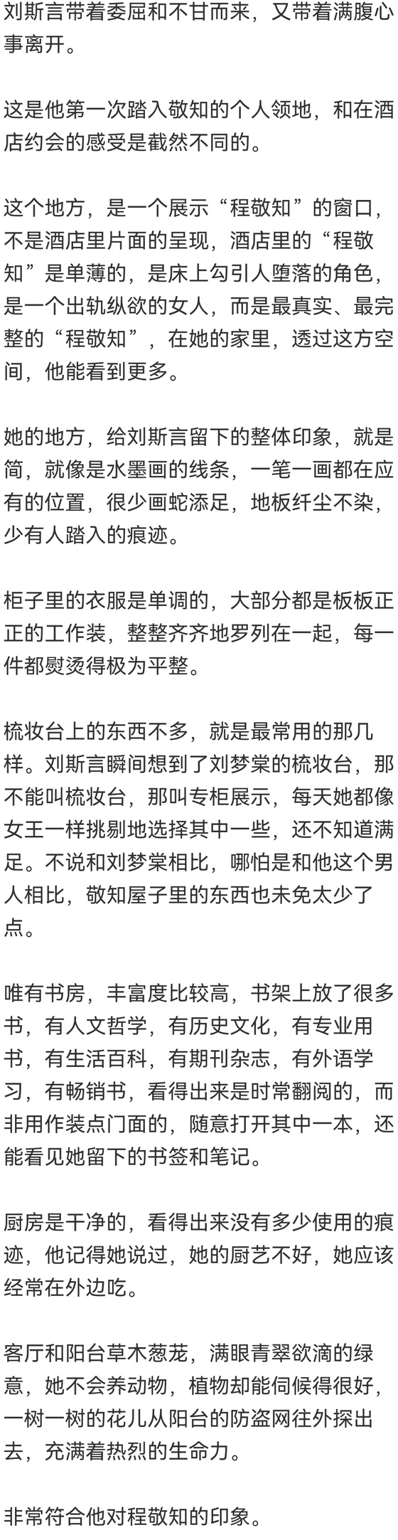 他没有参与过爱情战争,他和敬知的爱情是自然发生的,没有什么人夹在他们中间,所以难以理解刘斯言的挣扎和痛苦。