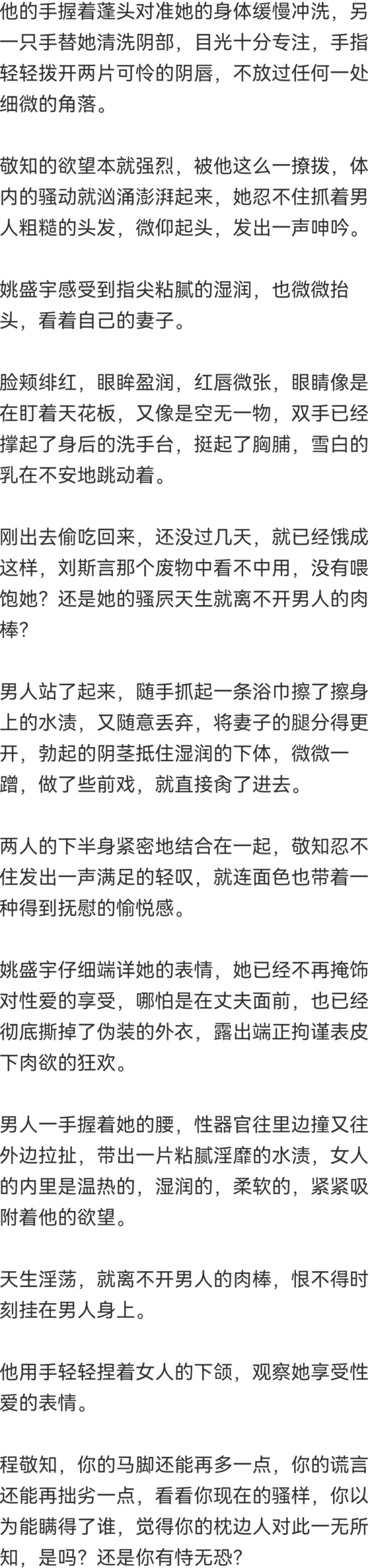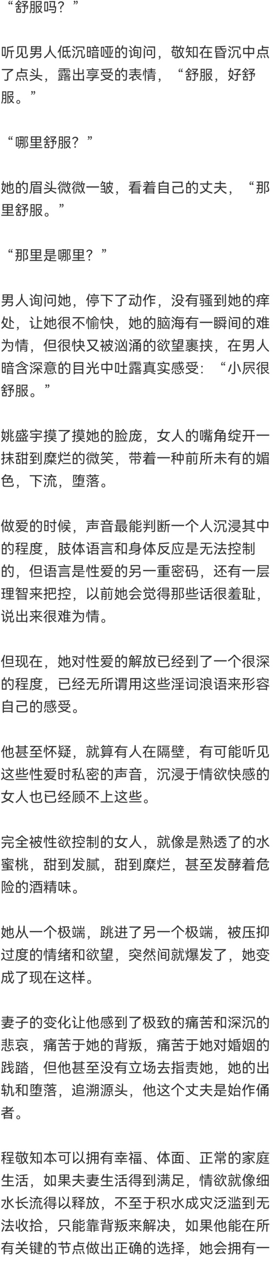 程敬知出身支离破碎的家庭,她是多么渴望拥有这些,但现在,她的快感机制已经产生了翻天覆地的变化,她不再渴望体面,不再渴望稳定圆满的家庭生活。