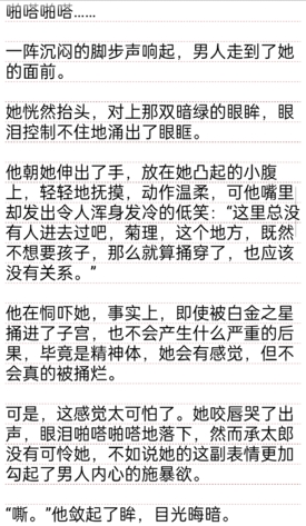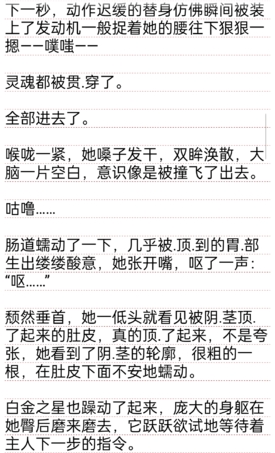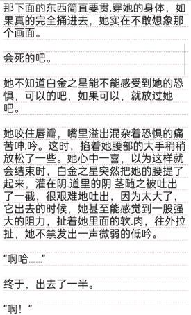 阴道.被撑得满满的,内.壁的每一条褶皱都被完全撑开。她的意识已经模糊了,她的身体还在坚守着。为了保护自己,大量的淫.液开始疯狂地分泌,白金之星每抽.出一下,堵在里头的液体就会喷涌而出,在还没来得及流尽时又被捅进来的肉.棒堵了回去,如此循环往复,她的肚子很快鼓了起来,像气球一般迅速吹起,里面全是